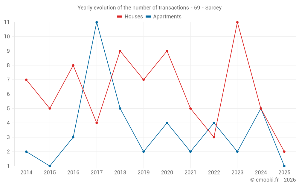 The median price on the 14 house transactions of the last 24 months in the municipality of Sarcey was 2 620 € per square meter for a median property value of 263 000 €. Over this period, 60% of transactions were between 1 845 and 3 333 € per square meter (from the 2nd to the 8th deciles).