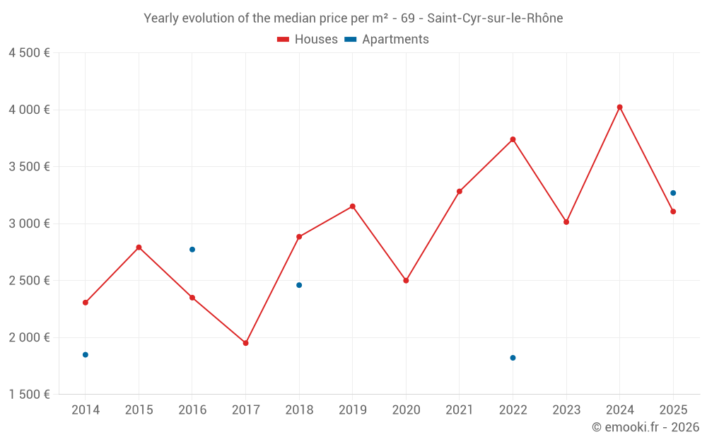 The median price on the 14 house transactions of the last 24 months in the municipality of Saint-Cyr-sur-le-Rhône was 3 481 € per square meter for a median property value of 397 505 €. Over this period, 60% of transactions were between 2 659 and 4 331 € per square meter (from the 2nd to the 8th deciles).