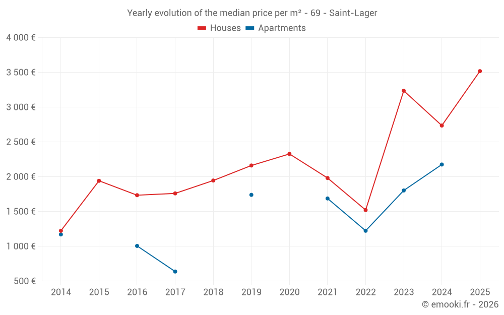 The median price on the 15 house transactions of the last 24 months in the municipality of Saint-Lager was 2 825 € per square meter for a median property value of 248 000 €. Over this period, 60% of transactions were between 2 361 and 3 454 € per square meter (from the 2nd to the 8th deciles).