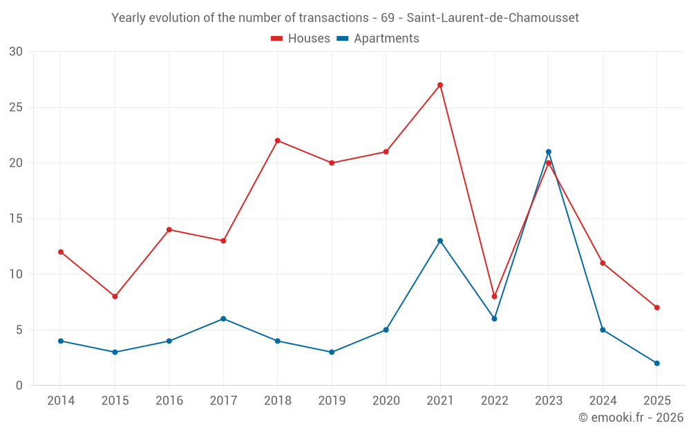 The median price on the 26 house transactions of the last 24 months in the municipality of Saint-Laurent-de-Chamousset was 2 039 € per square meter for a median property value of 199 750 €. Over this period, 60% of transactions were between 1 375 and 2 570 € per square meter (from the 2nd to the 8th deciles).
