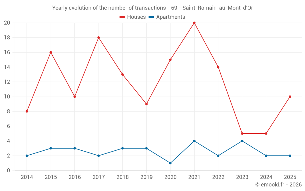 The median price on the 17 house transactions of the last 24 months in the municipality of Saint-Romain-au-Mont-d'Or was 5 345 € per square meter for a median property value of 629 640 €. Over this period, 60% of transactions were between 4 121 and 6 380 € per square meter (from the 2nd to the 8th deciles).