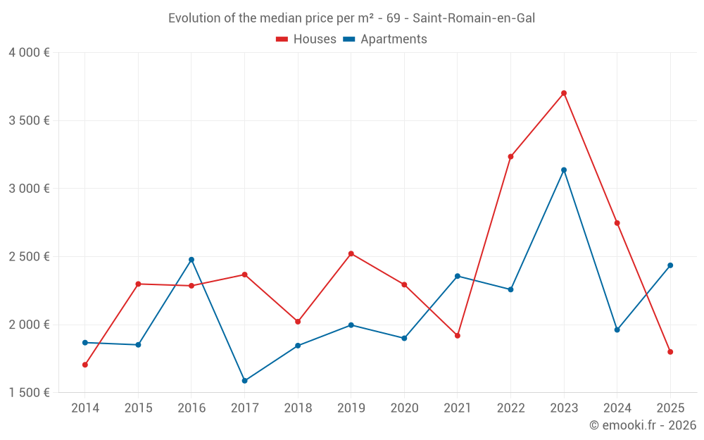 The median price on the 28 apartment transactions of the last 24 months in the municipality of Saint-Romain-en-Gal was 2 526 € per square meter for a median property value of 166 250 €. Over this period, 60% of transactions were between 1 816 and 3 710 € per square meter (from the 2nd to the 8th deciles).