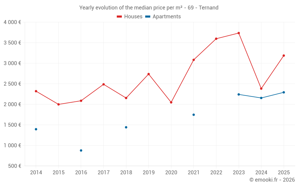 The median price on the 18 house transactions of the last 24 months in the municipality of Ternand was 2 487 € per square meter for a median property value of 215 388 €. Over this period, 60% of transactions were between 1 562 and 3 596 € per square meter (from the 2nd to the 8th deciles).