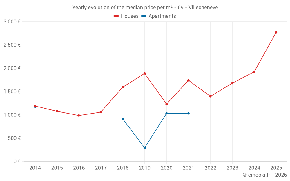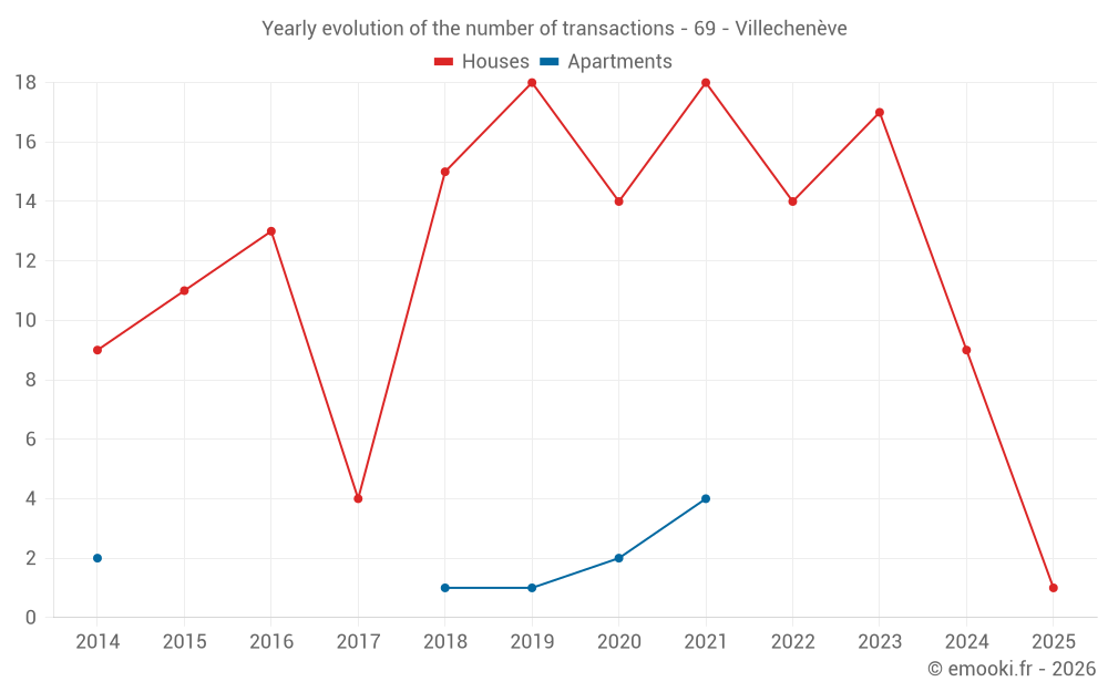 The median price on the 18 house transactions of the last 24 months in the municipality of Villechenève was 2 042 € per square meter for a median property value of 216 800 €. Over this period, 60% of transactions were between 1 129 and 2 778 € per square meter (from the 2nd to the 8th deciles).