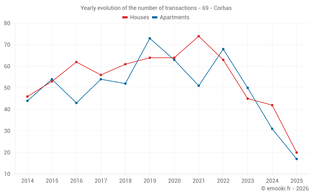 The median price on the 20 house transactions of the last 6 months in the municipality of Corbas was 3 720 € per square meter for a median property value of 320 465 €. Over this period, 60% of transactions were between 3 161 and 5 022 € per square meter (from the 2nd to the 8th deciles).