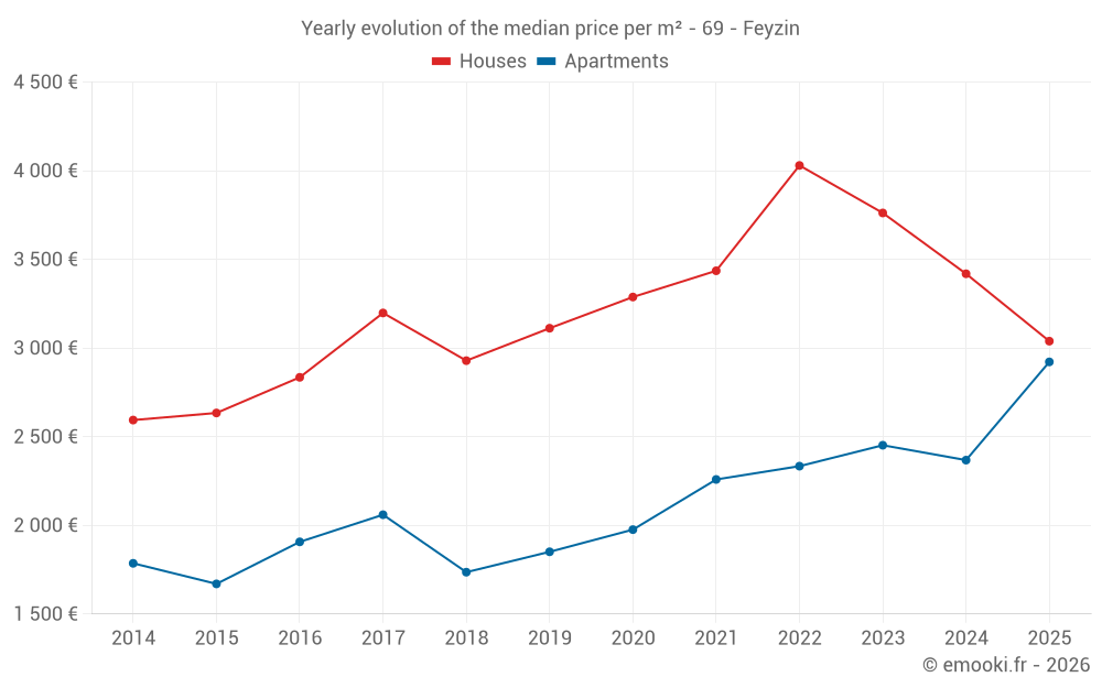 The median price on the 40 apartment transactions of the last 12 months in the municipality of Feyzin was 2 300 € per square meter for a median property value of 145 300 €. Over this period, 60% of transactions were between 1 781 and 3 299 € per square meter (from the 2nd to the 8th deciles).