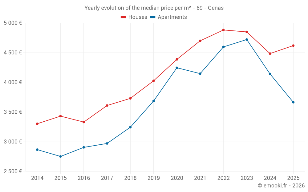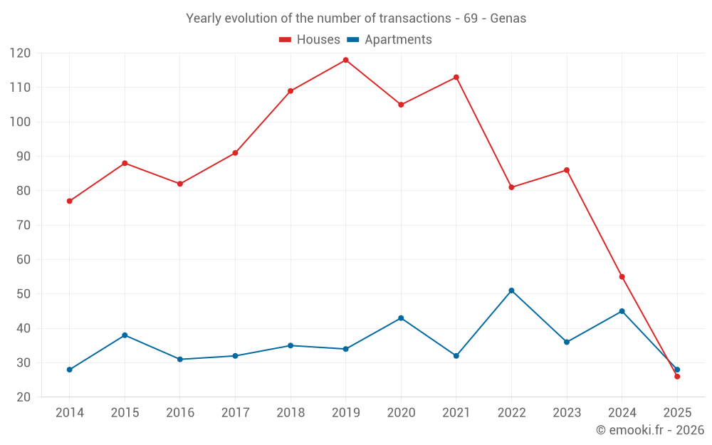 The median price on the 26 house transactions of the last 6 months in the municipality of Genas was 4 618 € per square meter for a median property value of 446 400 €. Over this period, 60% of transactions were between 3 708 and 5 194 € per square meter (from the 2nd to the 8th deciles).