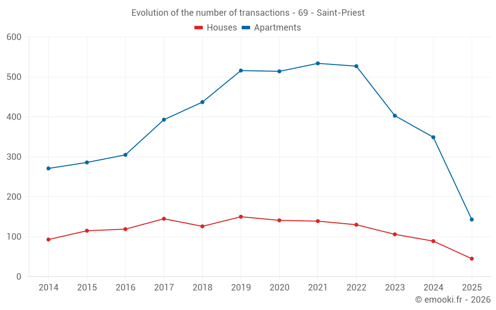 The median price on the 45 house transactions of the last 6 months in the municipality of Saint-Priest was 3 933 € per square meter for a median property value of 350 000 €. Over this period, 60% of transactions were between 3 459 and 4 399 € per square meter (from the 2nd to the 8th deciles).