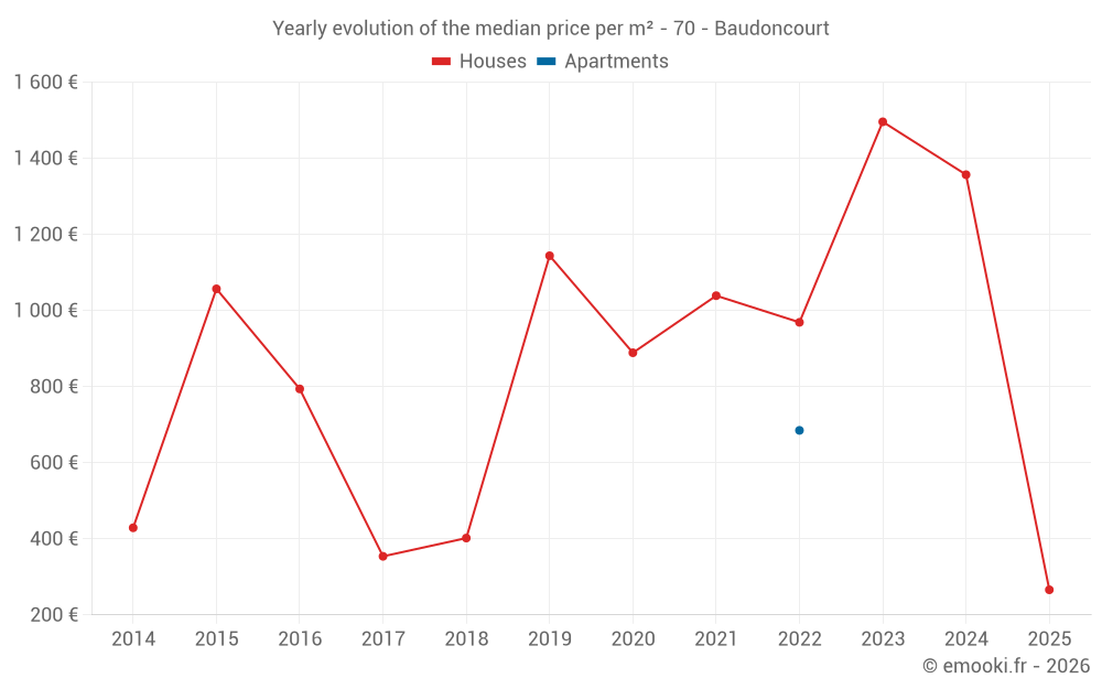 The median price on the 14 house transactions of the last 24 months in the municipality of Baudoncourt was 1 240 € per square meter for a median property value of 136 785 €. Over this period, 60% of transactions were between 757 and 1 622 € per square meter (from the 2nd to the 8th deciles).