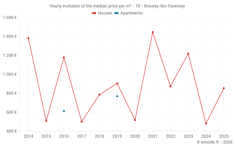 The median price on the 14 house transactions of the last 24 months in the municipality of Breurey-lès-Faverney was 833 € per square meter for a median property value of 134 050 €. Over this period, 60% of transactions were between 344 and 1 494 € per square meter (from the 2nd to the 8th deciles).