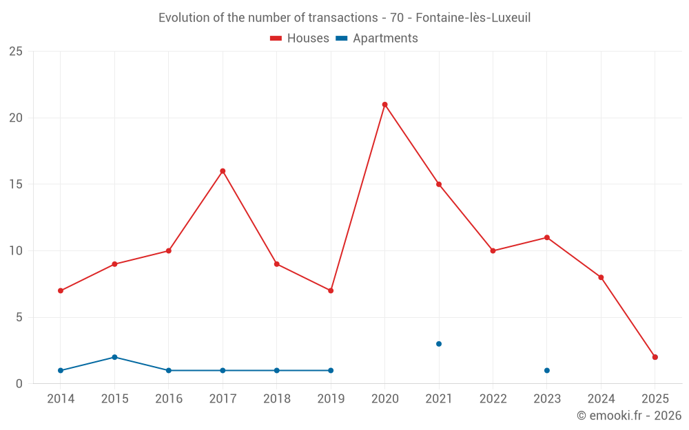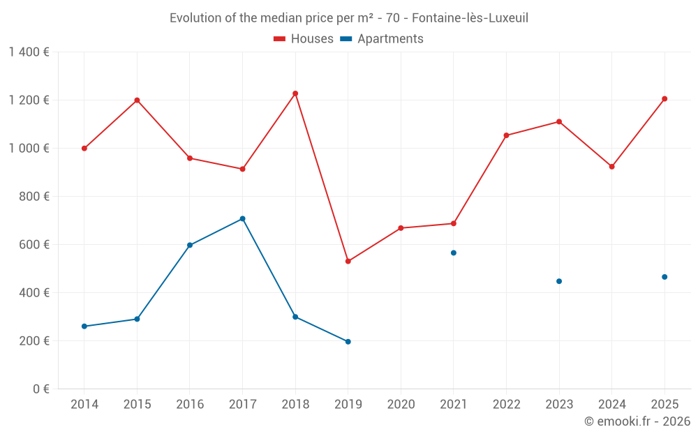 The median price on the 17 house transactions of the last 24 months in the municipality of Fontaine-lès-Luxeuil was 1 000 € per square meter for a median property value of 110 000 €. Over this period, 60% of transactions were between 742 and 1 491 € per square meter (from the 2nd to the 8th deciles).
