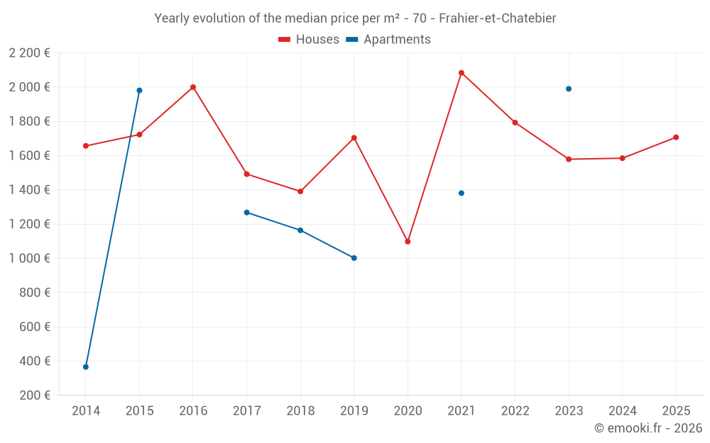 The median price on the 21 house transactions of the last 24 months in the municipality of Frahier-et-Chatebier was 1 579 € per square meter for a median property value of 132 310 €. Over this period, 60% of transactions were between 923 and 2 252 € per square meter (from the 2nd to the 8th deciles).
