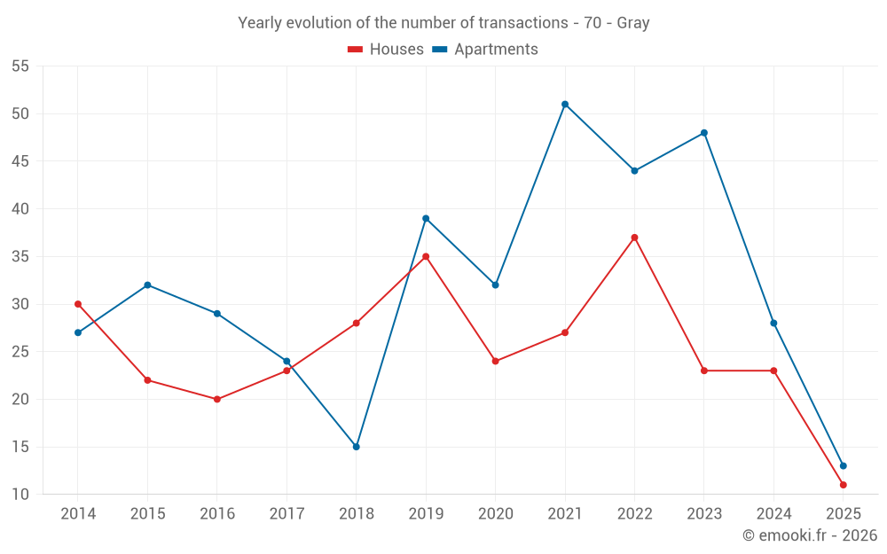 The median price on the 27 apartment transactions of the last 12 months in the municipality of Gray was 951 € per square meter for a median property value of 80 000 €. Over this period, 60% of transactions were between 562 and 1 201 € per square meter (from the 2nd to the 8th deciles).