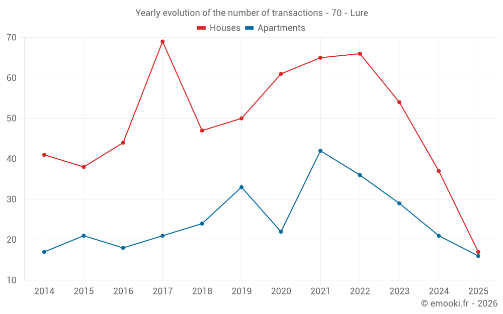 The median price on the 38 house transactions of the last 12 months in the municipality of Lure was 1 421 € per square meter for a median property value of 147 175 €. Over this period, 60% of transactions were between 874 and 1 849 € per square meter (from the 2nd to the 8th deciles).