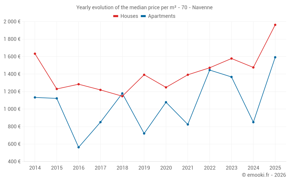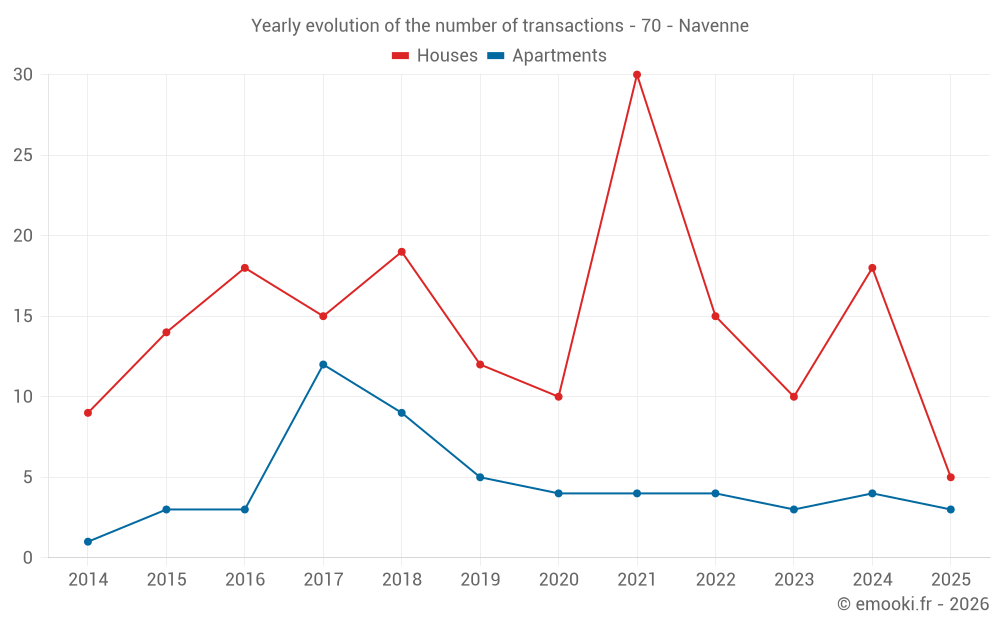 The median price on the 24 house transactions of the last 24 months in the municipality of Navenne was 1 526 € per square meter for a median property value of 159 250 €. Over this period, 60% of transactions were between 1 249 and 2 059 € per square meter (from the 2nd to the 8th deciles).