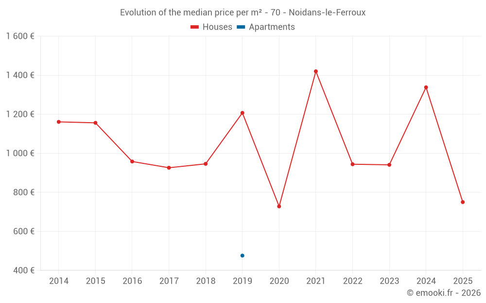 The median price on the 18 house transactions of the last 24 months in the municipality of Noidans-le-Ferroux was 1 136 € per square meter for a median property value of 92 500 €. Over this period, 60% of transactions were between 595 and 1 763 € per square meter (from the 2nd to the 8th deciles).