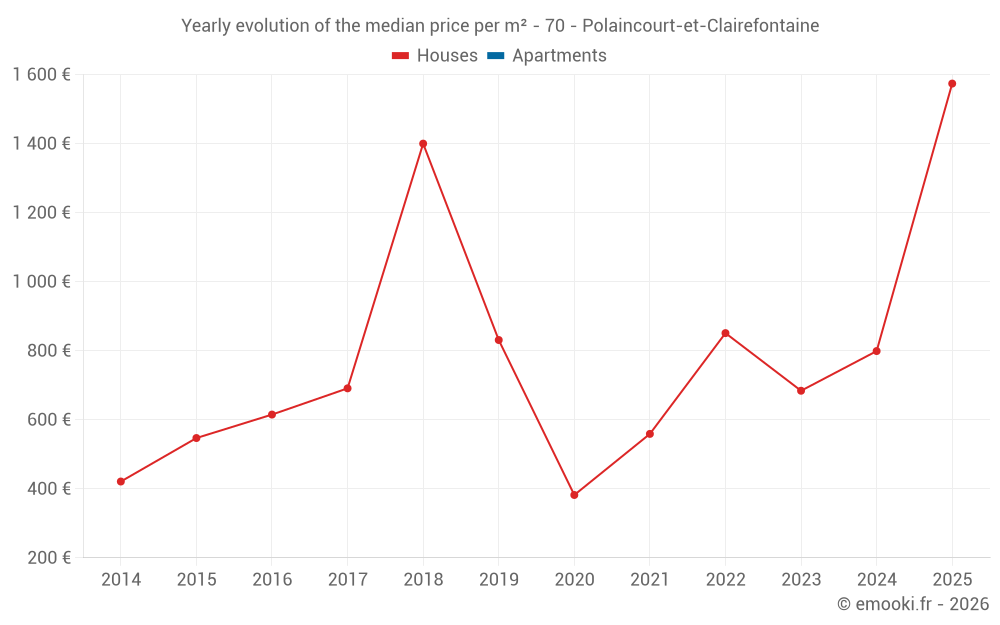 The median price on the 18 house transactions of the last 24 months in the municipality of Polaincourt-et-Clairefontaine was 864 € per square meter for a median property value of 82 750 €. Over this period, 60% of transactions were between 530 and 1 466 € per square meter (from the 2nd to the 8th deciles).