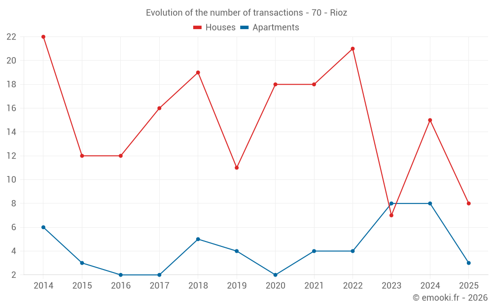 The median price on the 25 house transactions of the last 24 months in the municipality of Rioz was 2 162 € per square meter for a median property value of 217 000 €. Over this period, 60% of transactions were between 1 493 and 2 645 € per square meter (from the 2nd to the 8th deciles).