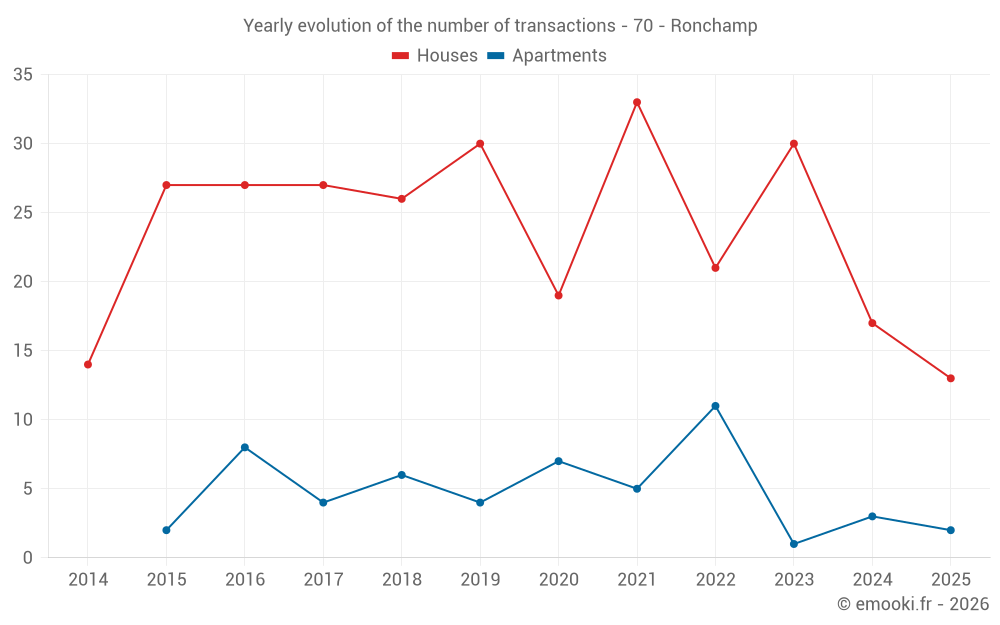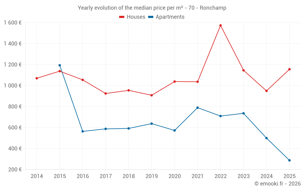 The median price on the 20 house transactions of the last 12 months in the municipality of Ronchamp was 1 148 € per square meter for a median property value of 117 850 €. Over this period, 60% of transactions were between 896 and 1 414 € per square meter (from the 2nd to the 8th deciles).