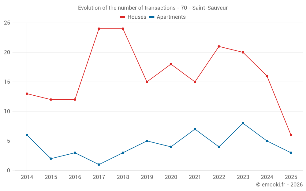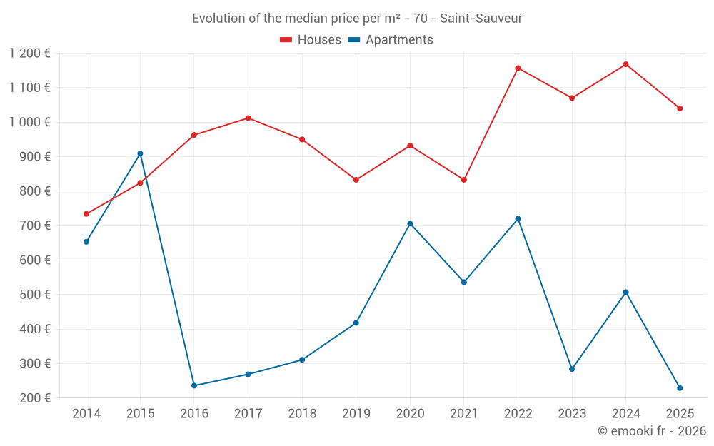 The median price on the 18 house transactions of the last 12 months in the municipality of Saint-Sauveur was 1 152 € per square meter for a median property value of 92 625 €. Over this period, 60% of transactions were between 576 and 1 374 € per square meter (from the 2nd to the 8th deciles).