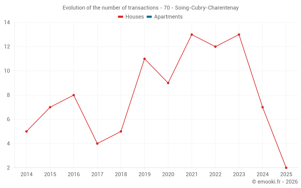 The median price on the 17 house transactions of the last 24 months in the municipality of Soing-Cubry-Charentenay was 673 € per square meter for a median property value of 69 000 €. Over this period, 60% of transactions were between 344 and 1 446 € per square meter (from the 2nd to the 8th deciles).