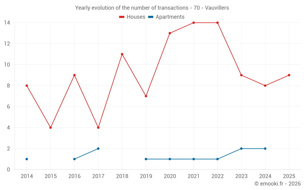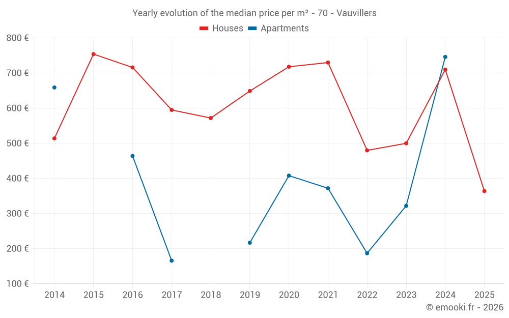 The median price on the 21 house transactions of the last 24 months in the municipality of Vauvillers was 500 € per square meter for a median property value of 50 000 €. Over this period, 60% of transactions were between 269 and 909 € per square meter (from the 2nd to the 8th deciles).