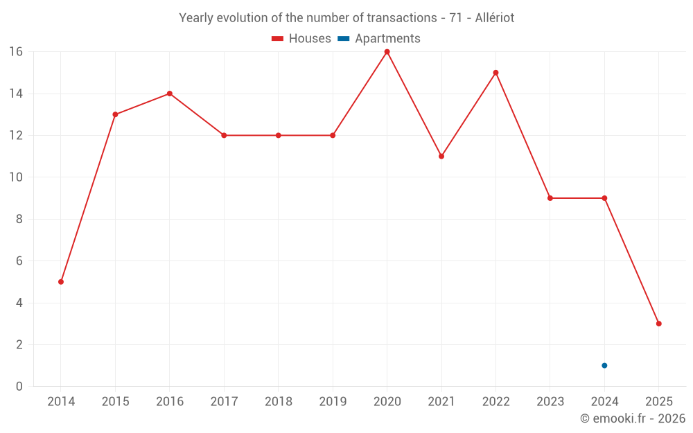 The median price on the 17 house transactions of the last 24 months in the municipality of Allériot was 1 977 € per square meter for a median property value of 197 950 €. Over this period, 60% of transactions were between 1 806 and 2 406 € per square meter (from the 2nd to the 8th deciles).
