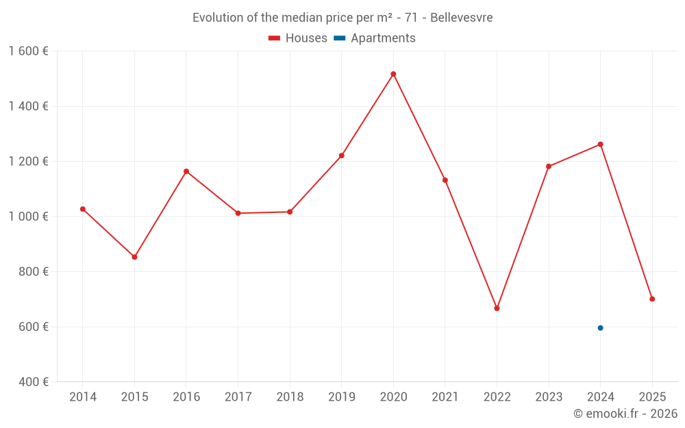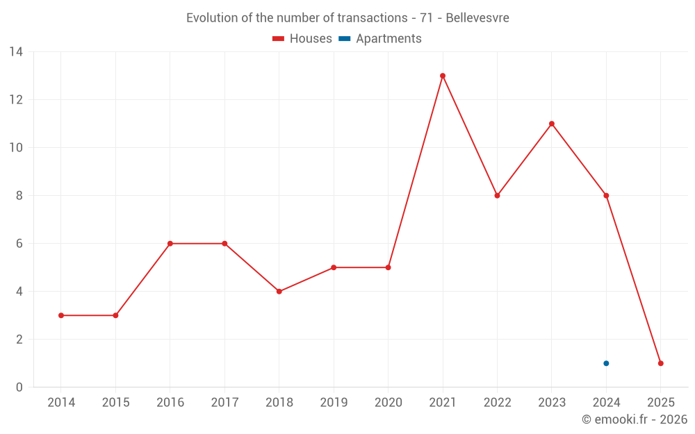 The median price on the 15 house transactions of the last 24 months in the municipality of Bellevesvre was 1 208 € per square meter for a median property value of 121 000 €. Over this period, 60% of transactions were between 696 and 1 719 € per square meter (from the 2nd to the 8th deciles).