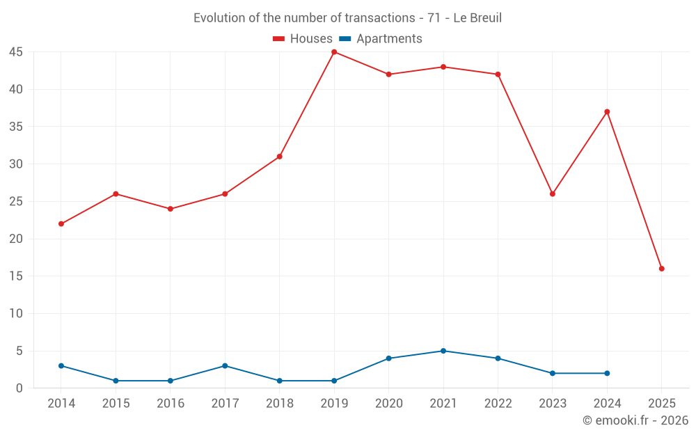 The median price on the 34 house transactions of the last 12 months in the municipality of Le Breuil was 1 448 € per square meter for a median property value of 136 965 €. Over this period, 60% of transactions were between 1 040 and 2 210 € per square meter (from the 2nd to the 8th deciles).