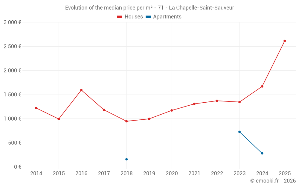 The median price on the 18 house transactions of the last 24 months in the municipality of La Chapelle-Saint-Sauveur was 1 670 € per square meter for a median property value of 176 470 €. Over this period, 60% of transactions were between 1 229 and 2 032 € per square meter (from the 2nd to the 8th deciles).