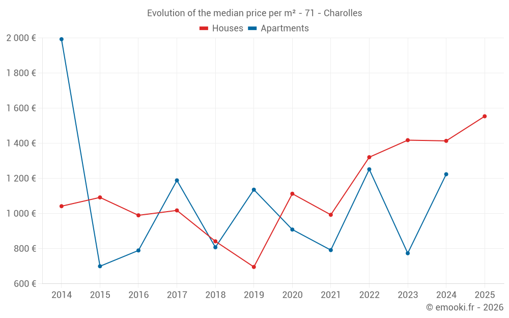 The median price on the 27 house transactions of the last 12 months in the municipality of Charolles was 1 380 € per square meter for a median property value of 129 000 €. Over this period, 60% of transactions were between 792 and 1 815 € per square meter (from the 2nd to the 8th deciles).