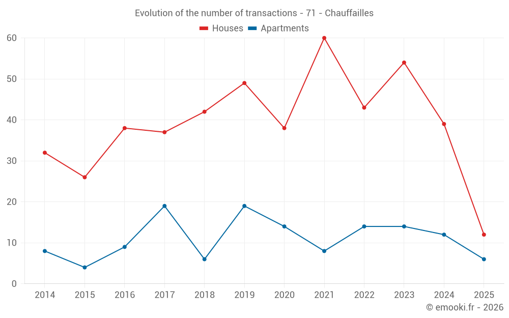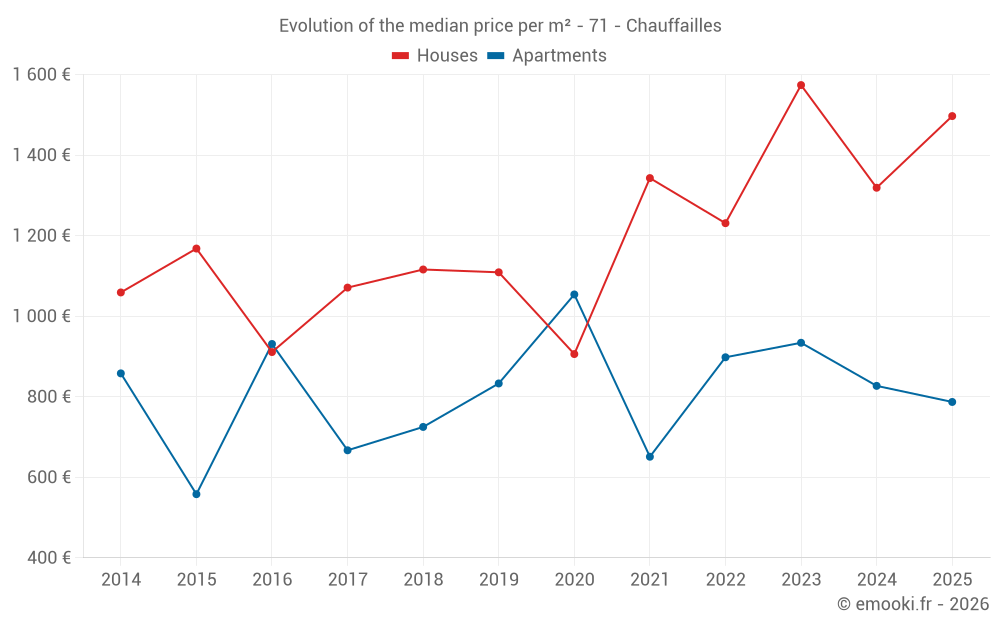 The median price on the 34 house transactions of the last 12 months in the municipality of Chauffailles was 1 410 € per square meter for a median property value of 145 150 €. Over this period, 60% of transactions were between 881 and 1 731 € per square meter (from the 2nd to the 8th deciles).