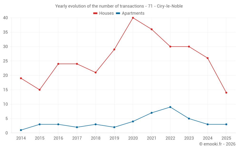The median price on the 30 house transactions of the last 12 months in the municipality of Ciry-le-Noble was 896 € per square meter for a median property value of 88 500 €. Over this period, 60% of transactions were between 510 and 1 330 € per square meter (from the 2nd to the 8th deciles).
