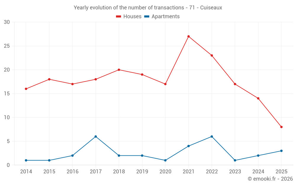 The median price on the 31 house transactions of the last 24 months in the municipality of Cuiseaux was 1 136 € per square meter for a median property value of 94 000 €. Over this period, 60% of transactions were between 525 and 1 750 € per square meter (from the 2nd to the 8th deciles).