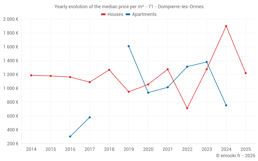 The median price on the 19 house transactions of the last 24 months in the municipality of Dompierre-les-Ormes was 1 842 € per square meter for a median property value of 158 000 €. Over this period, 60% of transactions were between 945 and 2 184 € per square meter (from the 2nd to the 8th deciles).