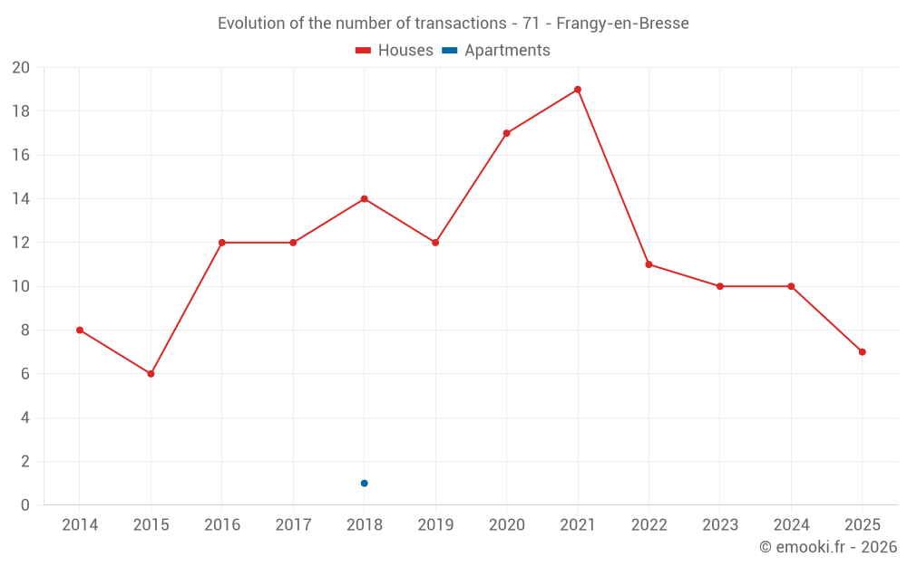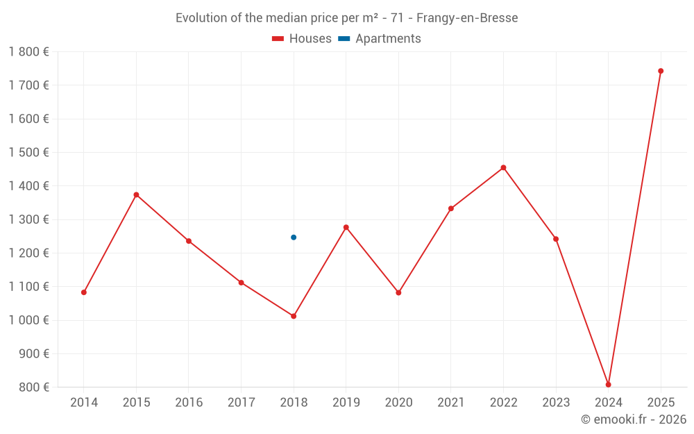 The median price on the 22 house transactions of the last 24 months in the municipality of Frangy-en-Bresse was 1 301 € per square meter for a median property value of 141 000 €. Over this period, 60% of transactions were between 712 and 1 863 € per square meter (from the 2nd to the 8th deciles).