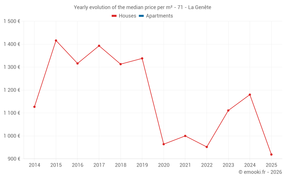 The median price on the 15 house transactions of the last 24 months in the municipality of La Genête was 1 171 € per square meter for a median property value of 125 000 €. Over this period, 60% of transactions were between 928 and 1 749 € per square meter (from the 2nd to the 8th deciles).