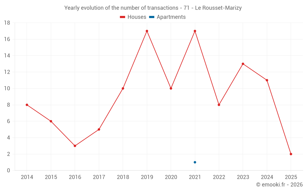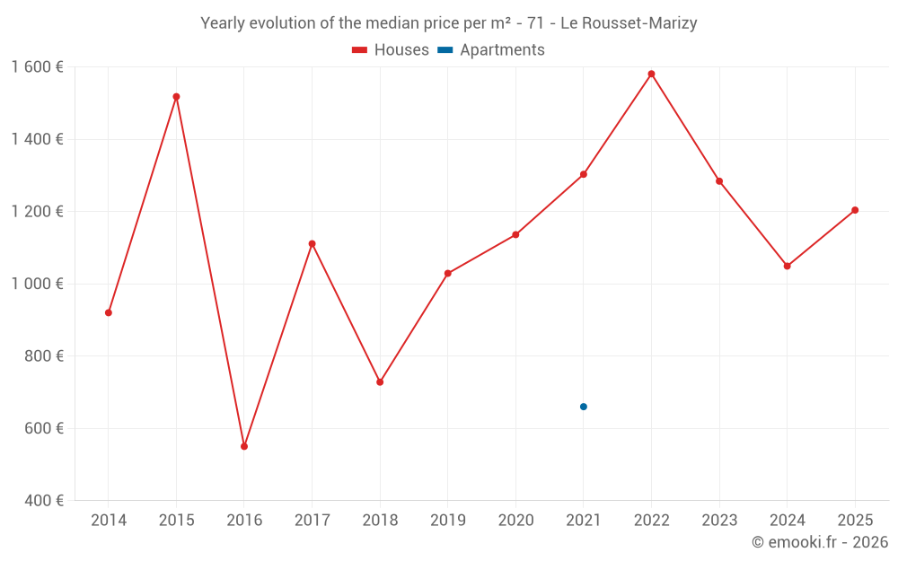 The median price on the 20 house transactions of the last 24 months in the municipality of Le Rousset-Marizy was 1 159 € per square meter for a median property value of 151 750 €. Over this period, 60% of transactions were between 679 and 2 238 € per square meter (from the 2nd to the 8th deciles).