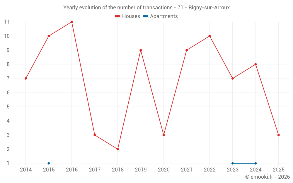 The median price on the 14 house transactions of the last 24 months in the municipality of Rigny-sur-Arroux was 858 € per square meter for a median property value of 72 750 €. Over this period, 60% of transactions were between 505 and 1 085 € per square meter (from the 2nd to the 8th deciles).