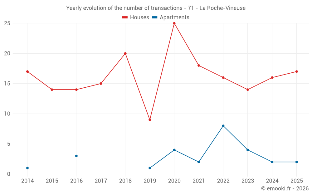 The median price on the 17 house transactions of the last 12 months in the municipality of La Roche-Vineuse was 2 548 € per square meter for a median property value of 250 000 €. Over this period, 60% of transactions were between 2 059 and 3 206 € per square meter (from the 2nd to the 8th deciles).
