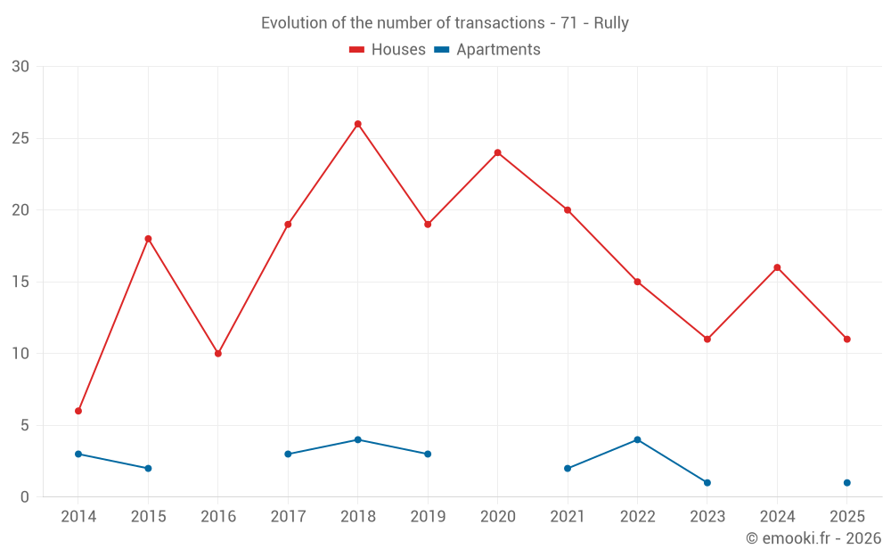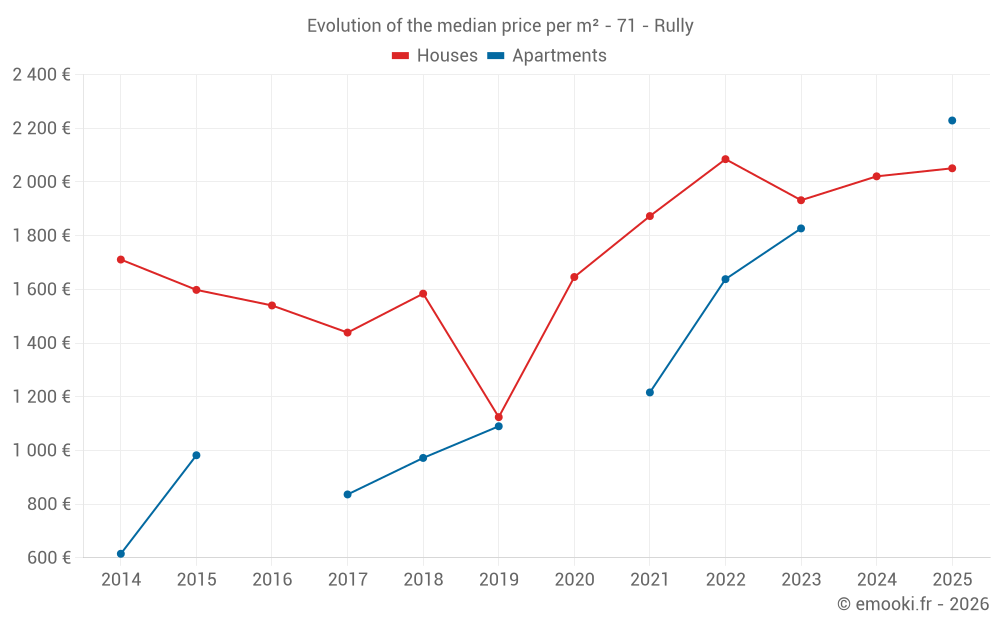 The median price on the 22 house transactions of the last 12 months in the municipality of Rully was 2 030 € per square meter for a median property value of 166 678 €. Over this period, 60% of transactions were between 1 485 and 2 600 € per square meter (from the 2nd to the 8th deciles).