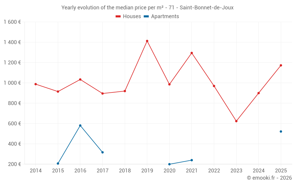The median price on the 19 house transactions of the last 24 months in the municipality of Saint-Bonnet-de-Joux was 783 € per square meter for a median property value of 81 000 €. Over this period, 60% of transactions were between 463 and 1 849 € per square meter (from the 2nd to the 8th deciles).