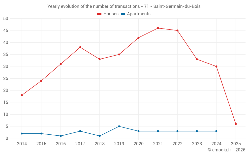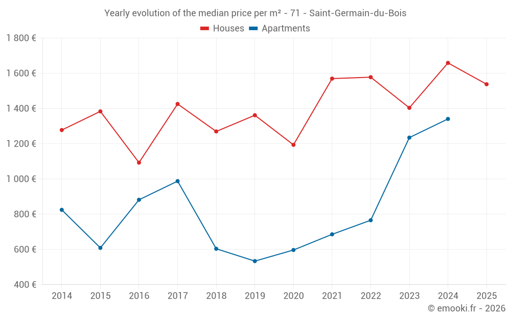 The median price on the 24 house transactions of the last 12 months in the municipality of Saint-Germain-du-Bois was 1 725 € per square meter for a median property value of 188 500 €. Over this period, 60% of transactions were between 1 374 and 2 106 € per square meter (from the 2nd to the 8th deciles).
