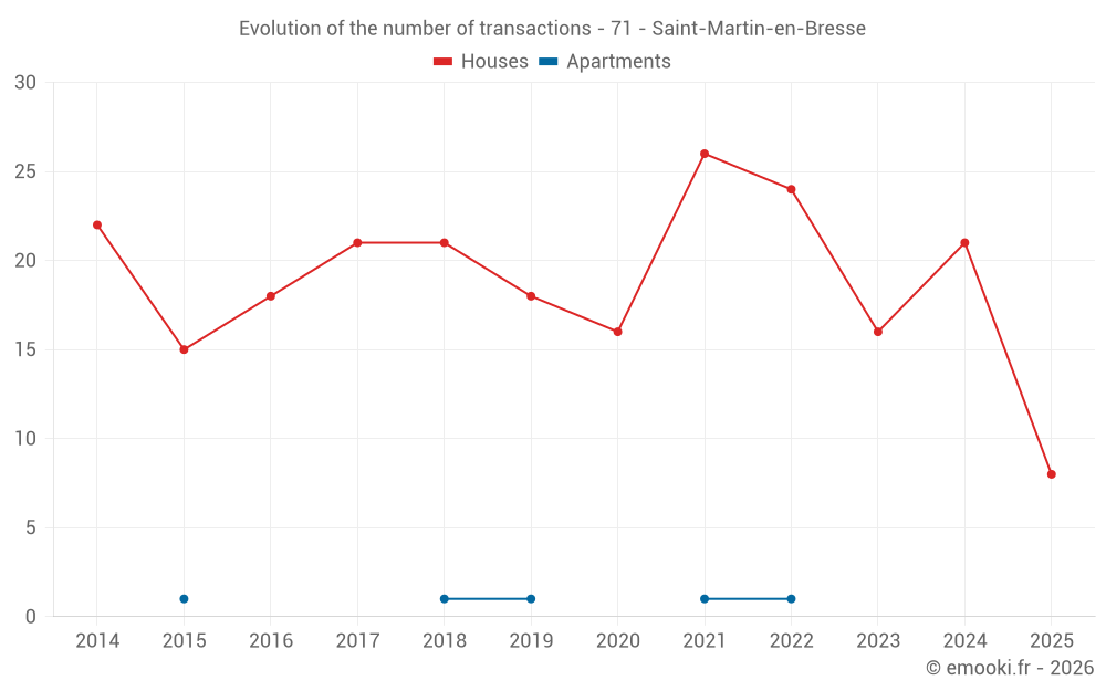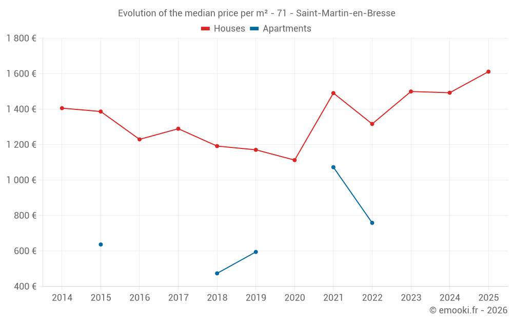 The median price on the 22 house transactions of the last 12 months in the municipality of Saint-Martin-en-Bresse was 1 656 € per square meter for a median property value of 180 950 €. Over this period, 60% of transactions were between 1 182 and 2 015 € per square meter (from the 2nd to the 8th deciles).