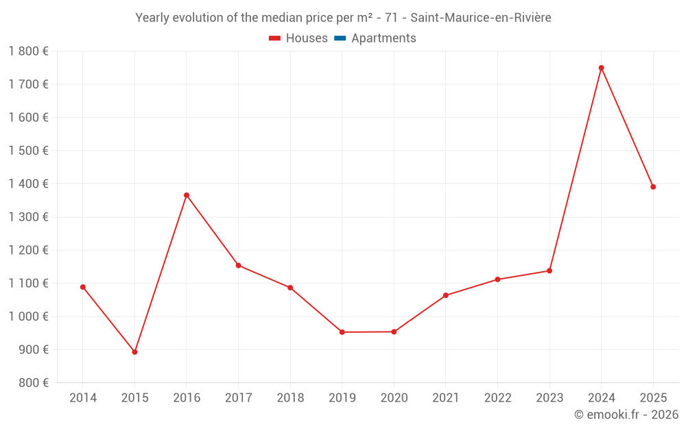 The median price on the 16 house transactions of the last 24 months in the municipality of Saint-Maurice-en-Rivière was 1 563 € per square meter for a median property value of 170 000 €. Over this period, 60% of transactions were between 1 026 and 1 815 € per square meter (from the 2nd to the 8th deciles).