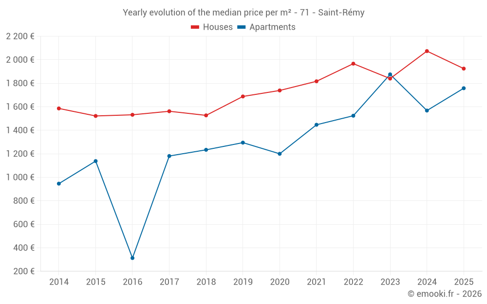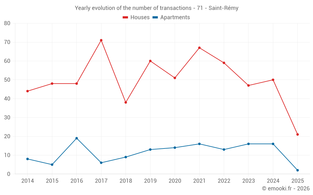 The median price on the 21 house transactions of the last 6 months in the municipality of Saint-Rémy was 1 925 € per square meter for a median property value of 200 000 €. Over this period, 60% of transactions were between 1 605 and 2 247 € per square meter (from the 2nd to the 8th deciles).