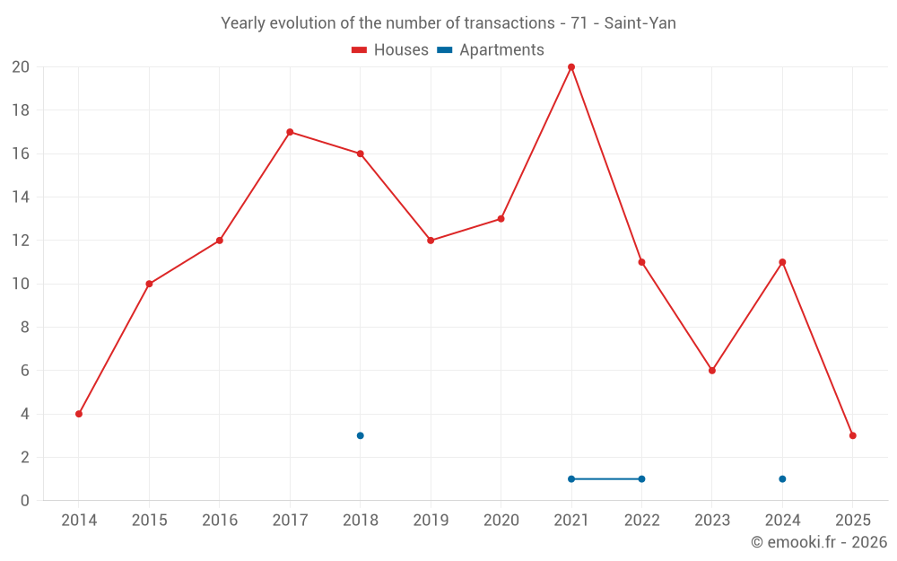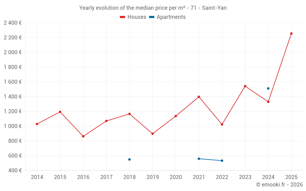 The median price on the 17 house transactions of the last 24 months in the municipality of Saint-Yan was 1 330 € per square meter for a median property value of 154 323 €. Over this period, 60% of transactions were between 907 and 2 132 € per square meter (from the 2nd to the 8th deciles).