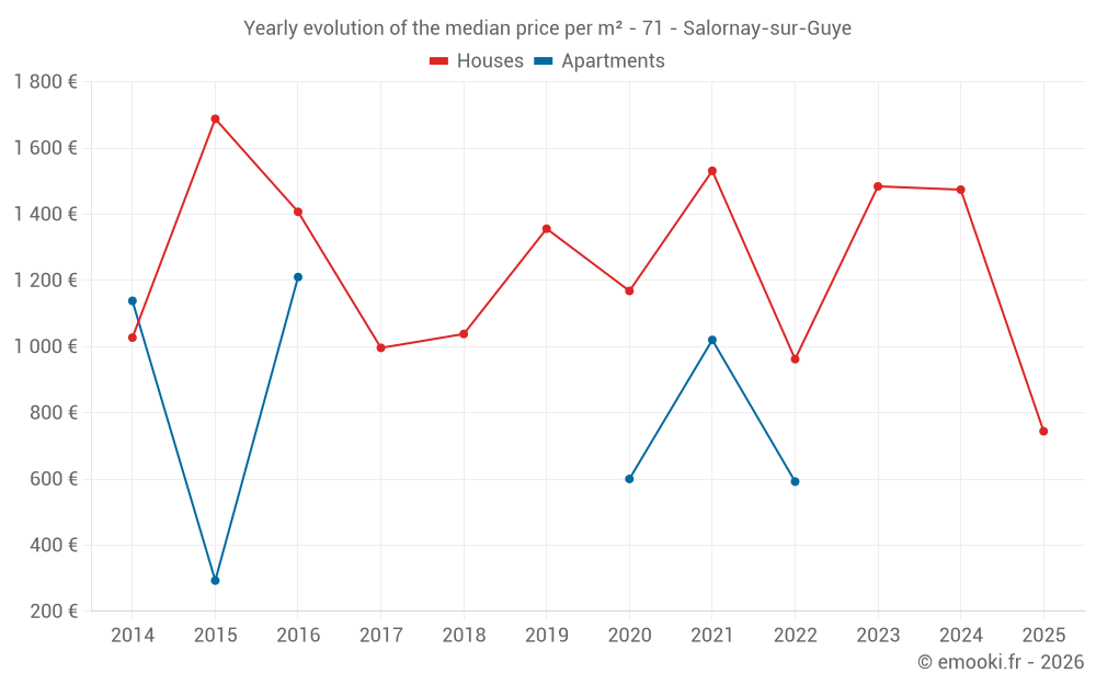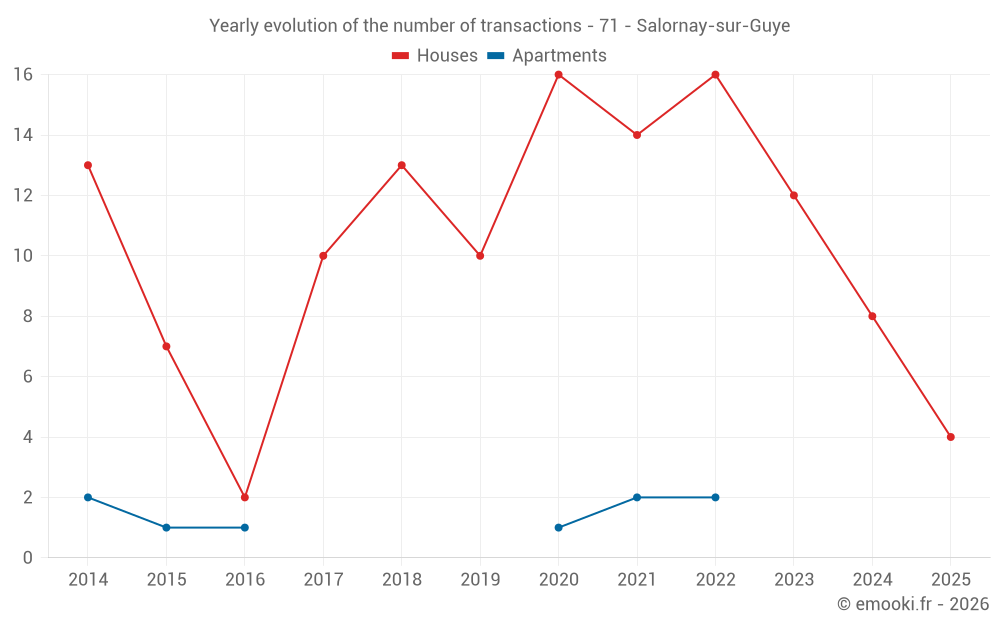 The median price on the 17 house transactions of the last 24 months in the municipality of Salornay-sur-Guye was 1 039 € per square meter for a median property value of 80 000 €. Over this period, 60% of transactions were between 565 and 2 073 € per square meter (from the 2nd to the 8th deciles).