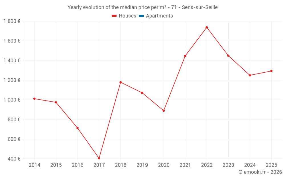 The median price on the 14 house transactions of the last 24 months in the municipality of Sens-sur-Seille was 1 308 € per square meter for a median property value of 139 500 €. Over this period, 60% of transactions were between 541 and 1 795 € per square meter (from the 2nd to the 8th deciles).