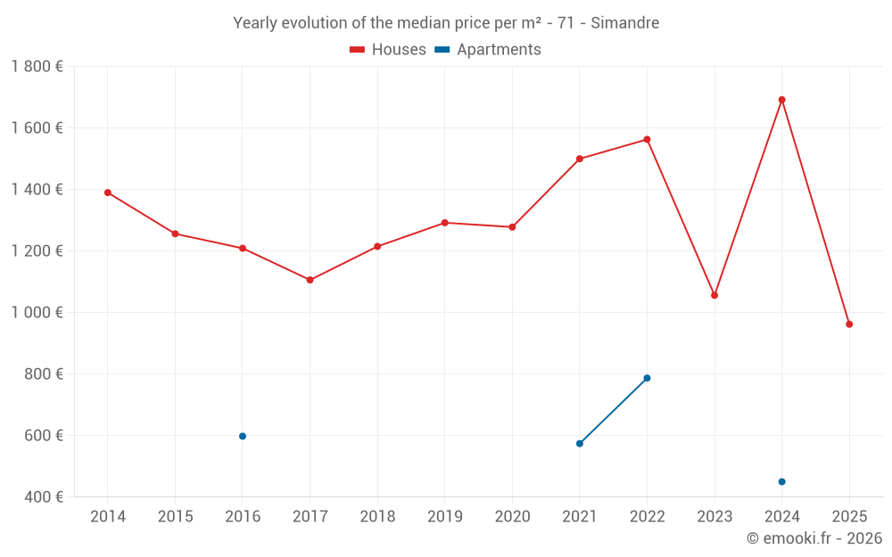 The median price on the 20 house transactions of the last 12 months in the municipality of Simandre was 1 460 € per square meter for a median property value of 151 500 €. Over this period, 60% of transactions were between 876 and 1 958 € per square meter (from the 2nd to the 8th deciles).